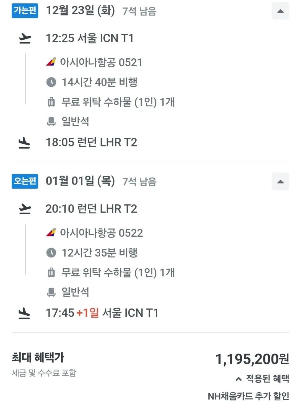 아시아나 직항을 타고 12월 23일 런던에 도착합니다. 그리고 1월 1일 오후 8시에 다시 서울로 출발합니다.