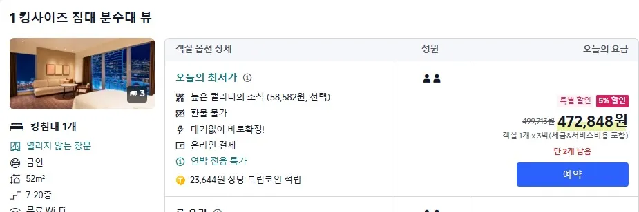그렇지만 마카오의 그랜드 하얏트에선 멋진 분수쇼가 보이는 방을 같은 기간 동안 47만 원에 예약할 수 있어요!