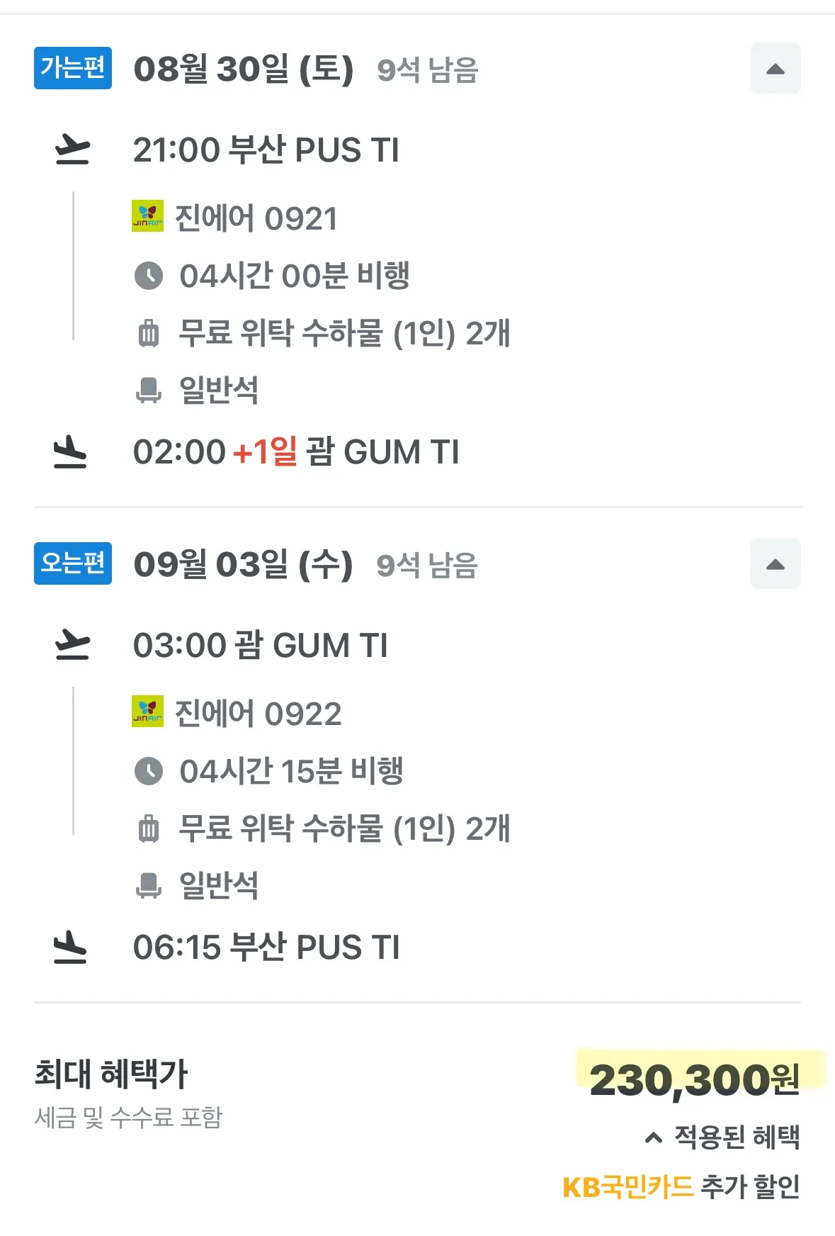 - 8월 30일(토) - 9월 3일(수) 부산 -> 괌 23만원