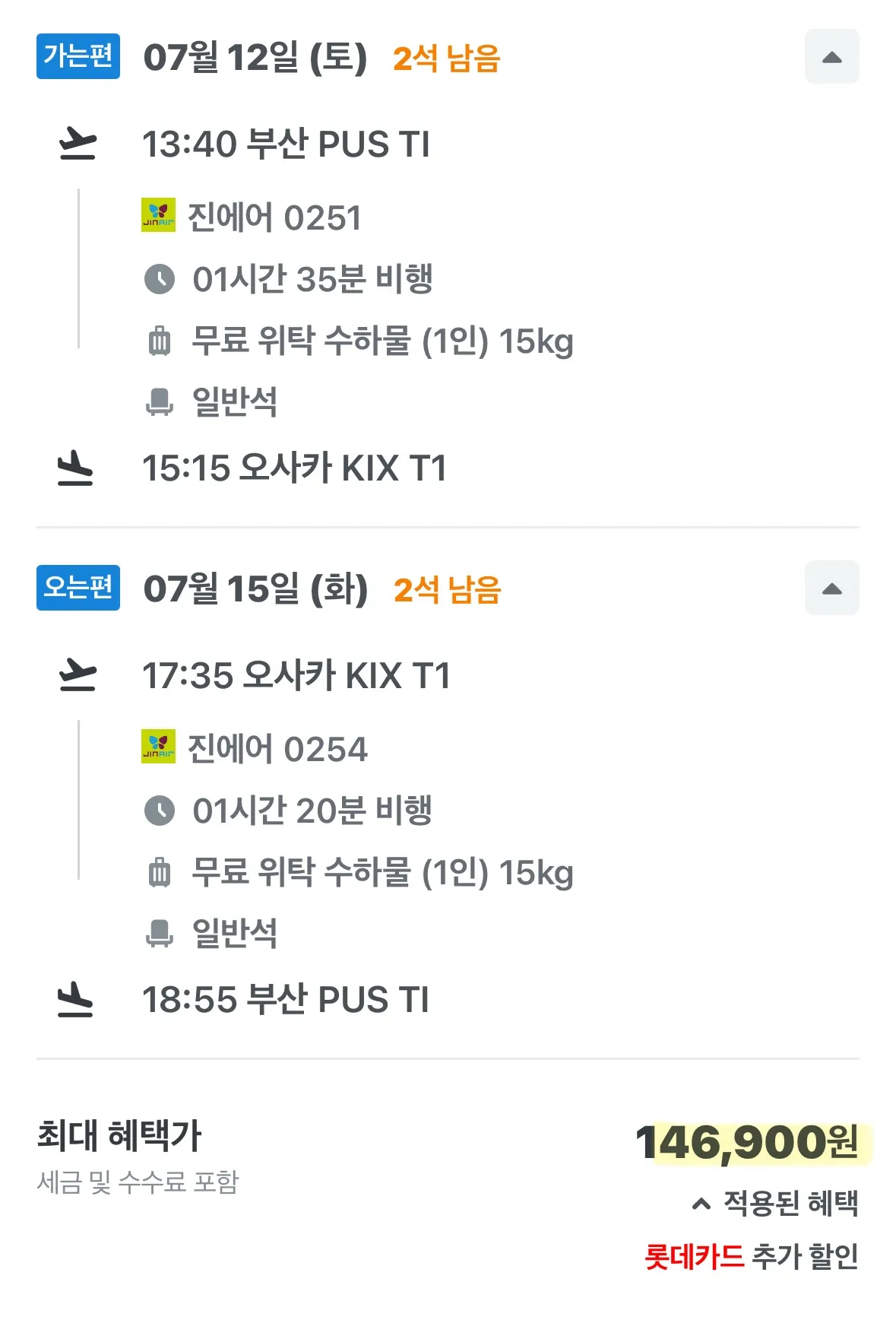 - 7월 12일(토) - 7월 15일(화) 부산 -> 오사카 14만원대