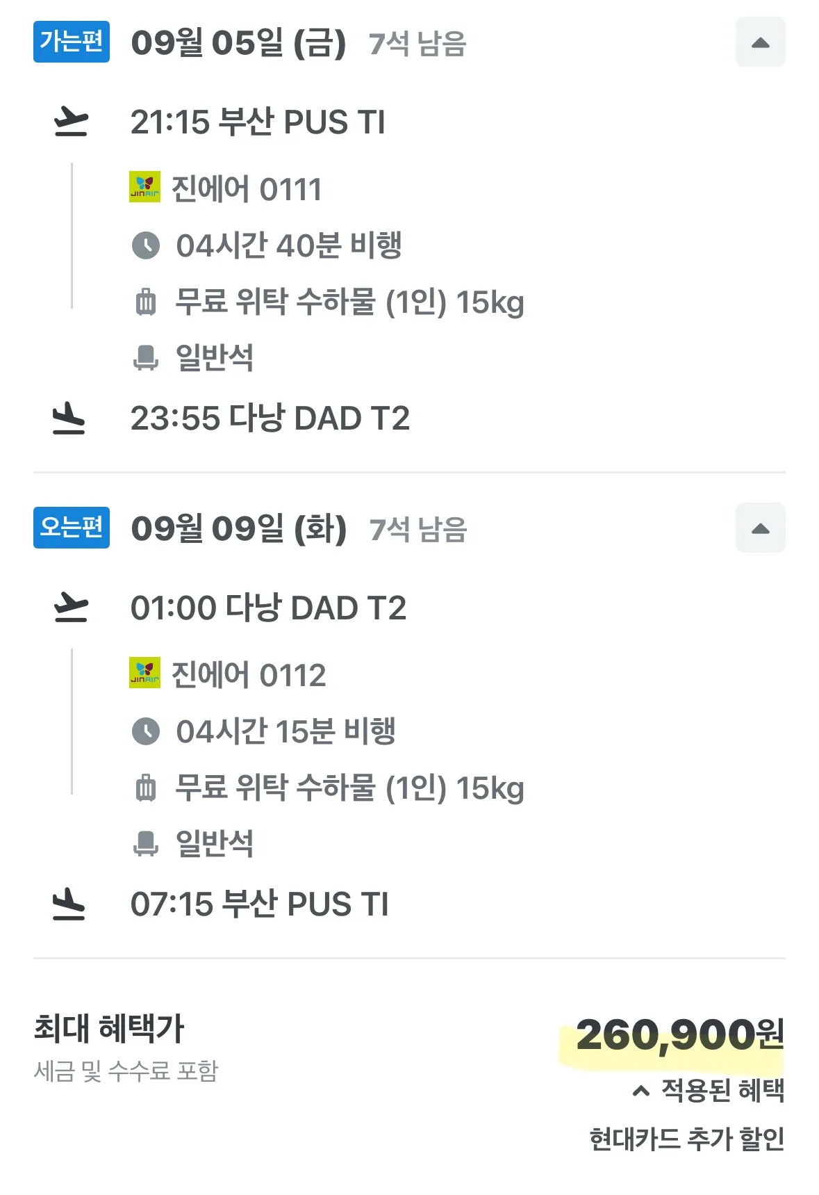 - 9월 5일(금) - 9월 9일(화) 부산 -> 다낭 26만원