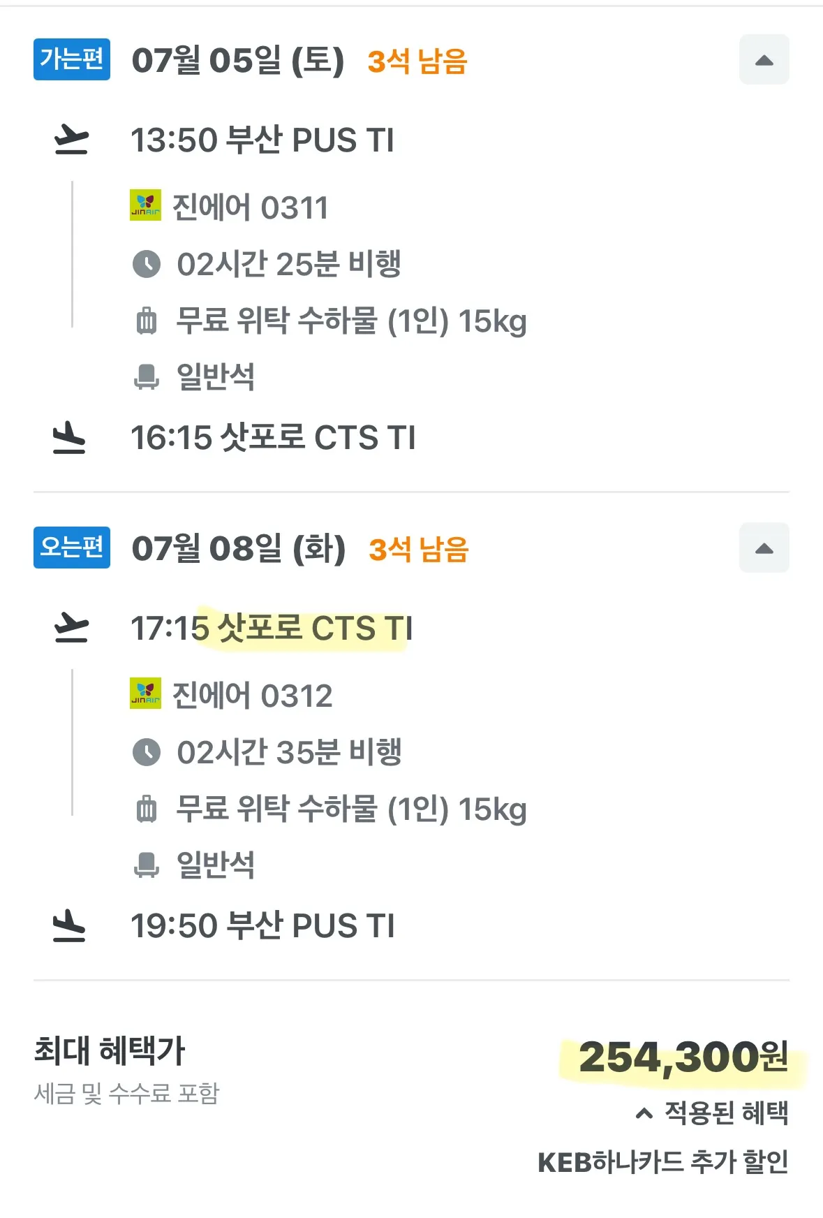 - 7월 5일(토) - 7월 8일(화) 부산 -> 삿포로 25만원대