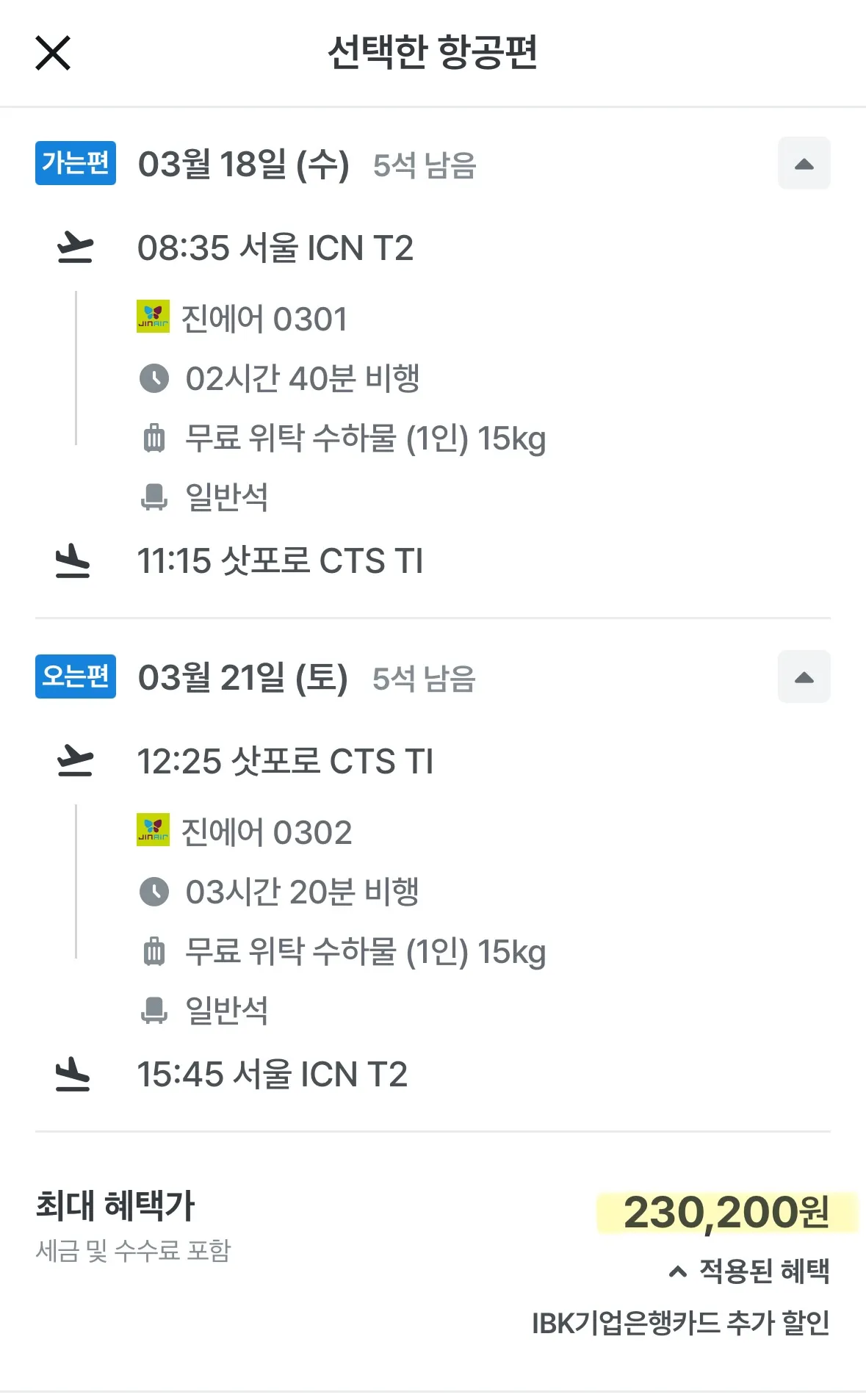 수요일부터 토요일까지, 4일 동안 삿포로 왕복 항공권이 23만원으로 가능해요.