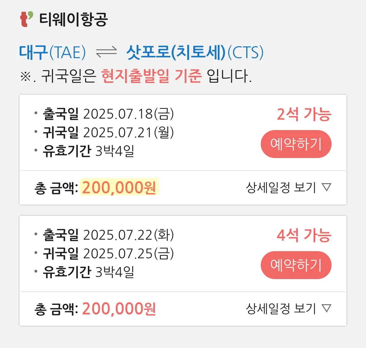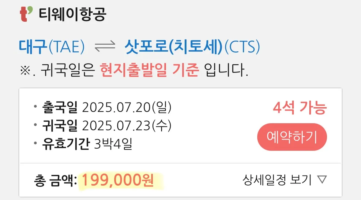 대구 출발, 삿포로 도착, 10만원대