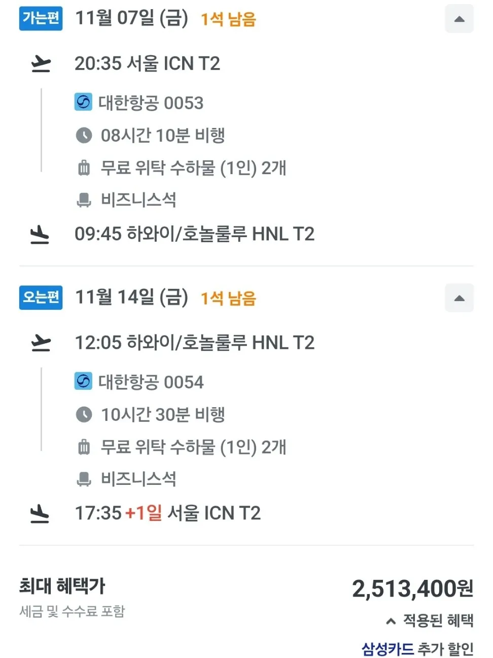 하와이로 가는 대한항공 비즈니스 클래스 왕복 항공권이 450만 원에서 240만 원으로 할인되었습니다.