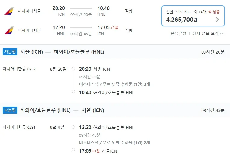 인천에서 하와이로, 비즈니스 왕복 1,977,700원!