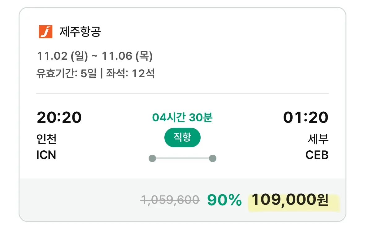 서울에서 세부까지 저렴하게! 9.99만 원 항공권