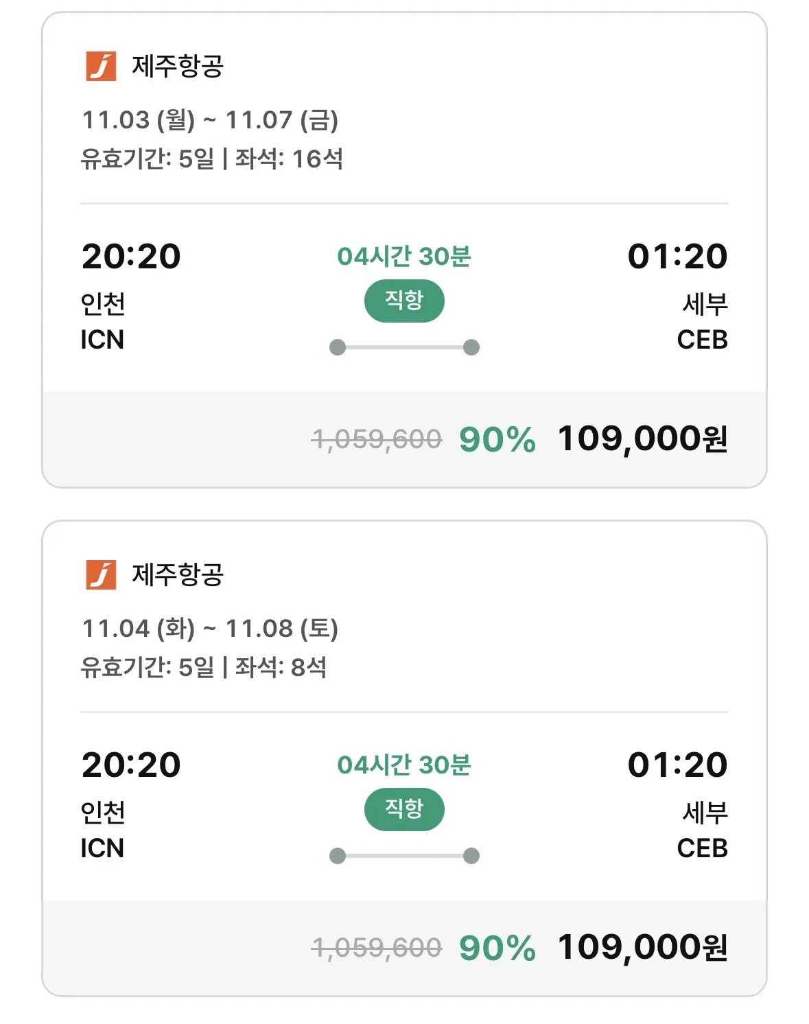 수목금토일 이렇게 5일 동안 떠나는 여행 비용이 놀랍게도 109,000원이에요! 물론 다른 요일로도 다양한 저렴한 항공권이 있답니다. 😉