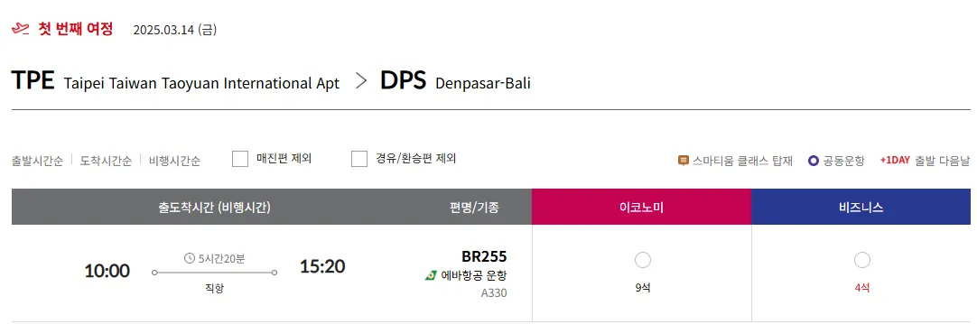 날짜에 따라, TPE → DPS 구간도 비즈니스 9좌석이 있는 경우가 있습니다.