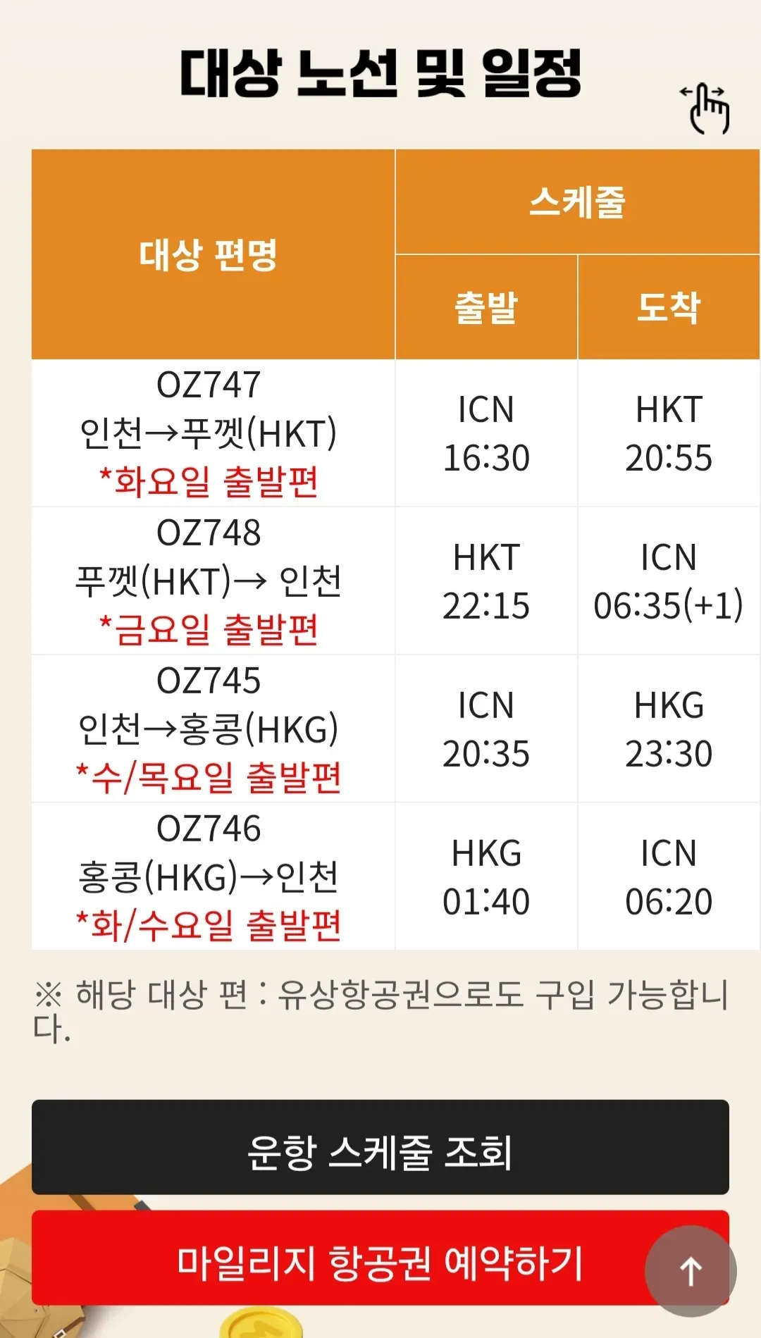 아시아나 보너스 좌석 최대 오픈(푸켓, 홍콩 구간)