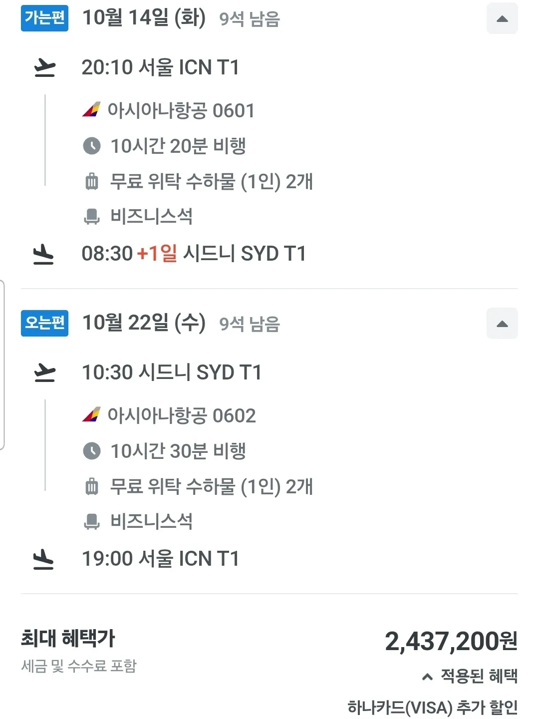 아시아나 비즈니스 왕복 항공권의 가격은 약 2,437,200원입니다.