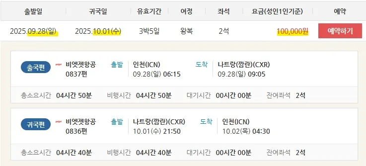 9월 28일(일)부터 10월 1일(수)까지 인천에서 나트랑까지 10만원에 갈 수 있고,