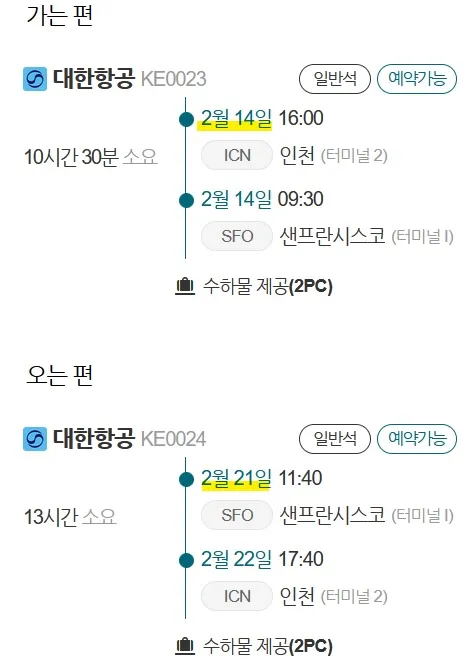 두 번째는 대한항공을 타고 인천에서 샌프란시스코로 가는 직항 편입니다.
