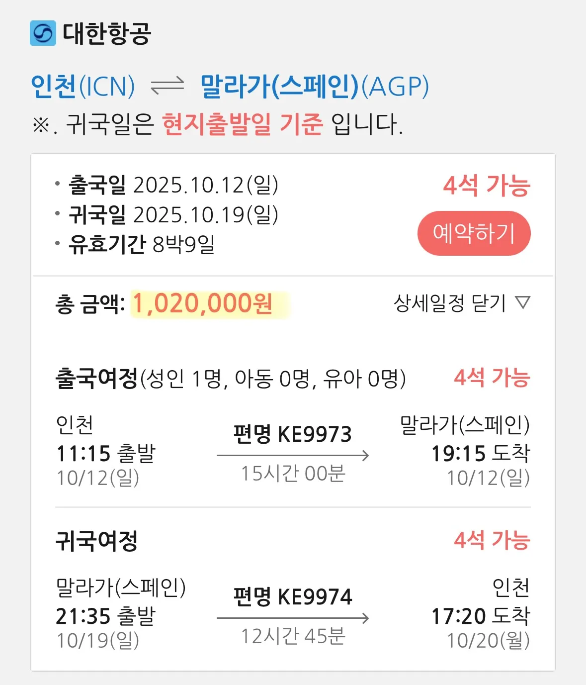 안녕하세요! 대한항공에서 스페인 말라가 직항 항공권을 확인해봤어요.