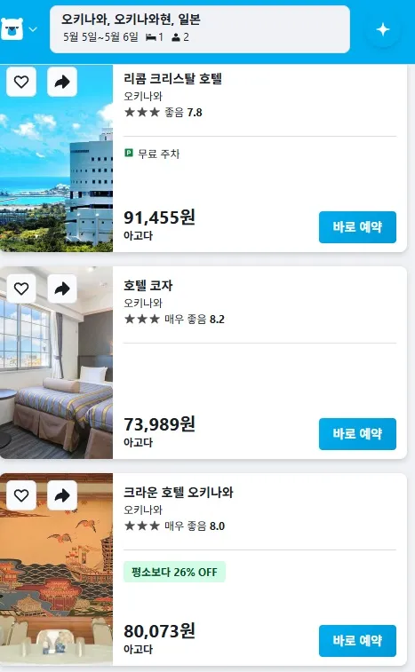 골든위크라고 비싸다고 생각할 수도 있지만, 5월 5일부터는 끝나는 주라서 호텔 가격이 크게 안 달라!