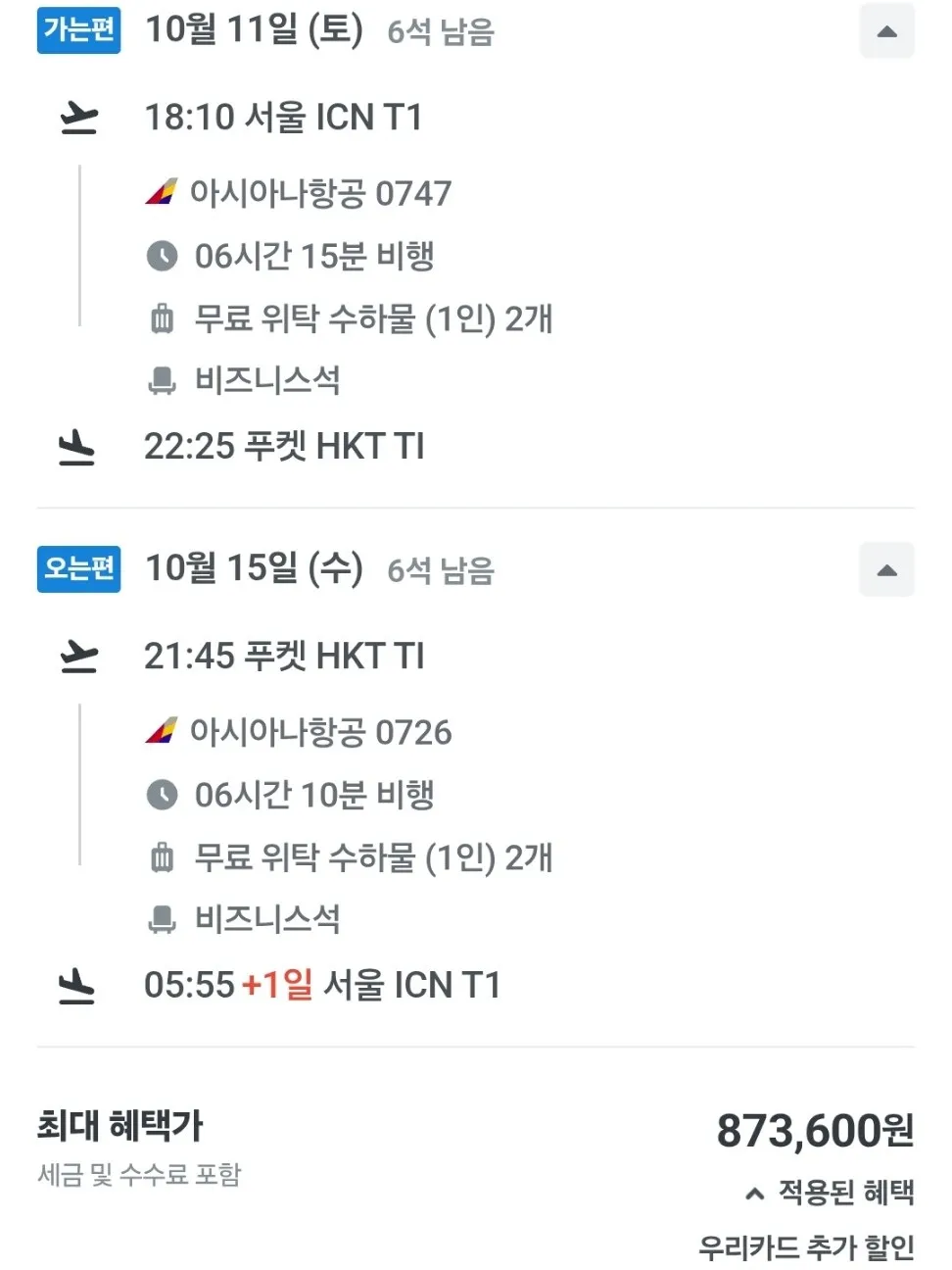 비즈니스 좌석으로 인천에서 푸켓까지 직항, 아시아나항공으로 87만 원에 다녀왔어요.
