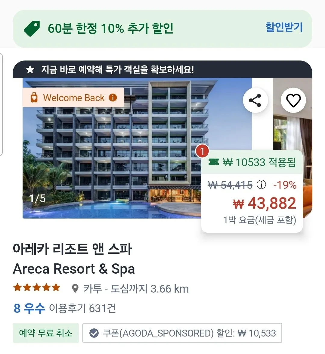 푸켓에서 머무를 동안 선택한 곳은 아레카 리조트 & 스파로, 5성급임에도 불구하고 4만 3천 원대에 이용했답니다.
