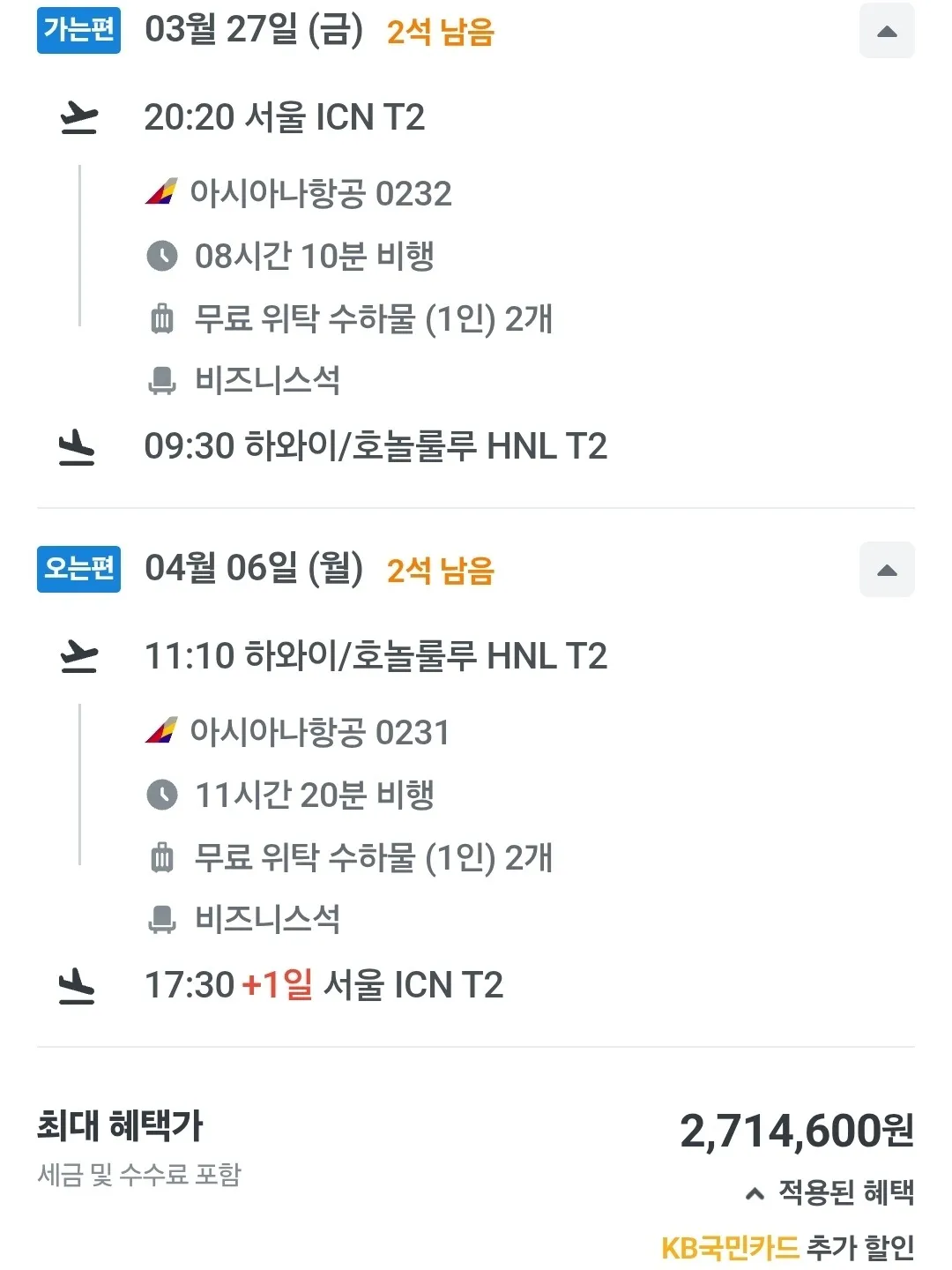 인천에서 하와이까지 아시아나 비즈니스 클래스 왕복 티켓을 271만원에 구했습니다.