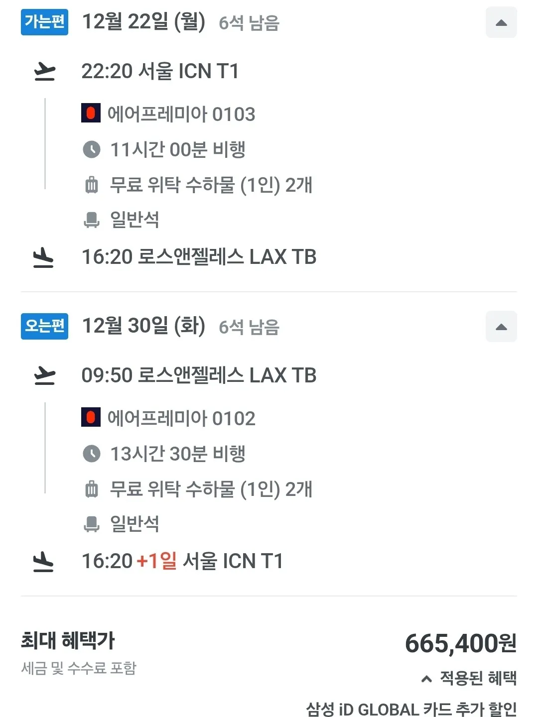 인천에서 LA까지의 왕복 직항 항공권이 665,400원에 나왔어요! 🎉