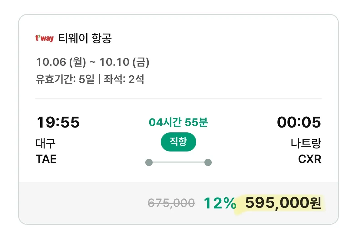 10월 6일(월)부터 10월 10일(금)까지 대구에서 나트랑으로 59만 원!