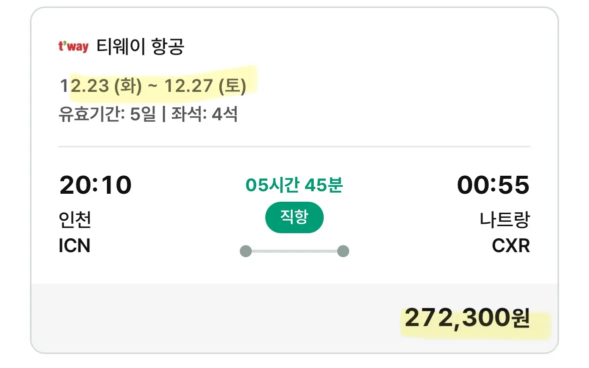 인천에서 나트랑으로 가는 항공권은 27만원입니다. (4석 남음)
