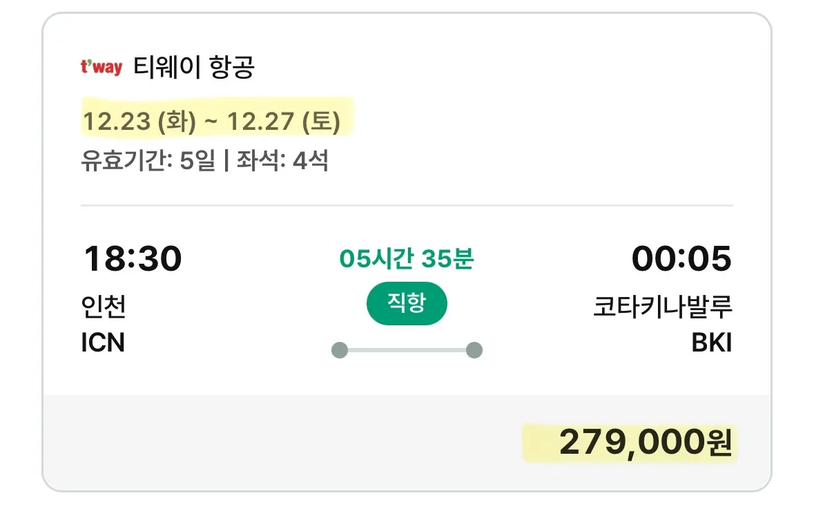 그리고 인천에서 코타키나발루로 떠나는 항공권은 28만원으로 할인 중입니다. (4석 남음)