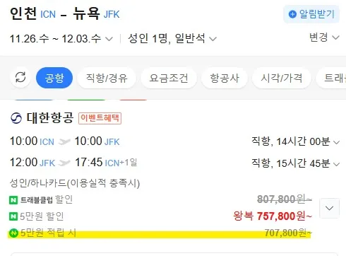 대한항공 타고 인천에서 뉴욕은 70만원이라네요!