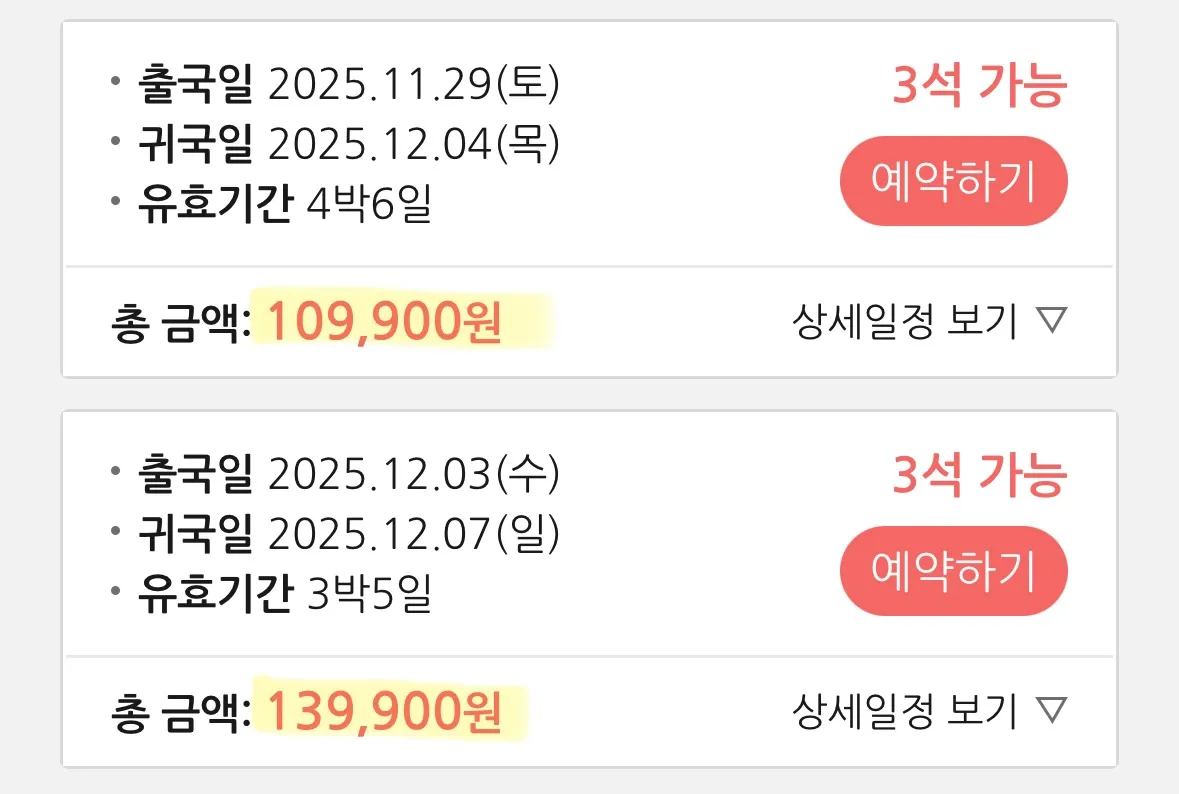 개인적으로는 12월 3일부터 12월 7일까지의 두 번째 일정이 더 매력적으로 보이네요.