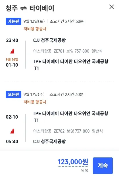 앗, 이런 특가 항공권이라니! 청주와 타이베이를 왕복하는 항공권이 106,600원이라구요?