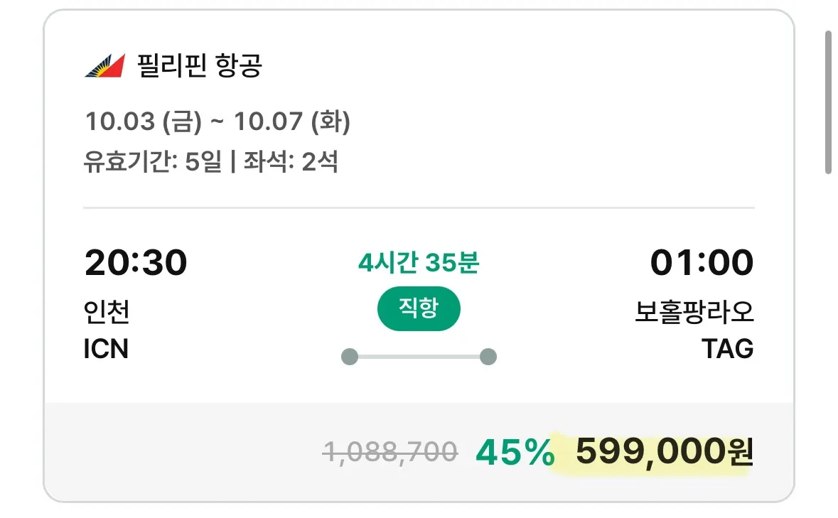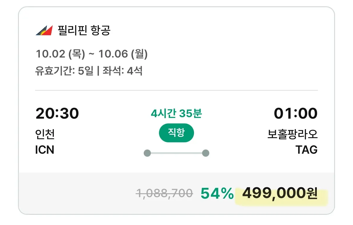 보홀: 10월 2일(목)부터 10월 6일(월)까지 49.9만 원으로 예약 가능합니다.