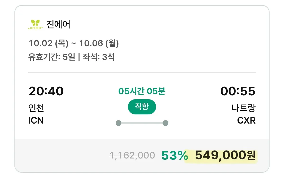 나트랑: 10월 2일(목)부터 10월 6일(월)까지의 일정으로, 54.9만 원에 이용할 수 있어요.