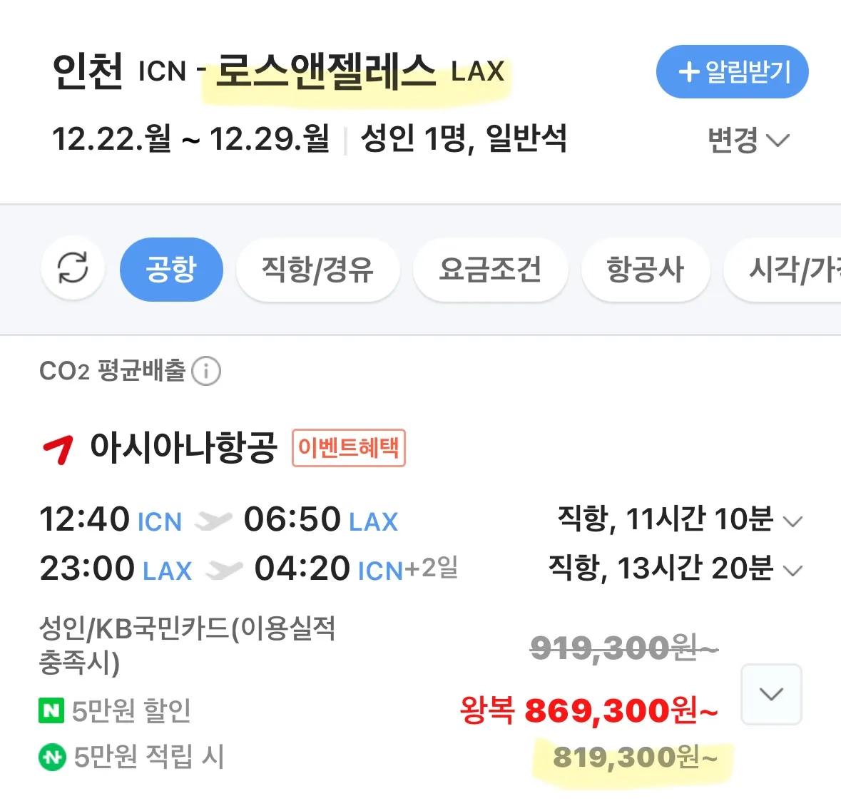 - 로스앤젤레스: 아시아나항공, 12월 22일부터 12월 29일까지, 가격은 81만 원입니다.