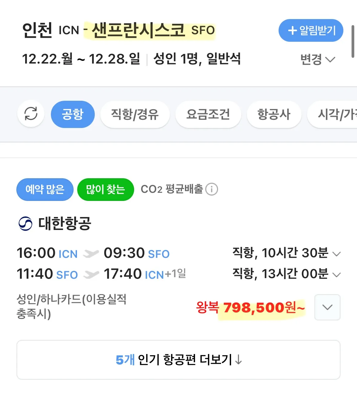- 샌프란시스코: 대한항공, 12월 22일부터 12월 28일까지, 가격은 79만 원입니다.