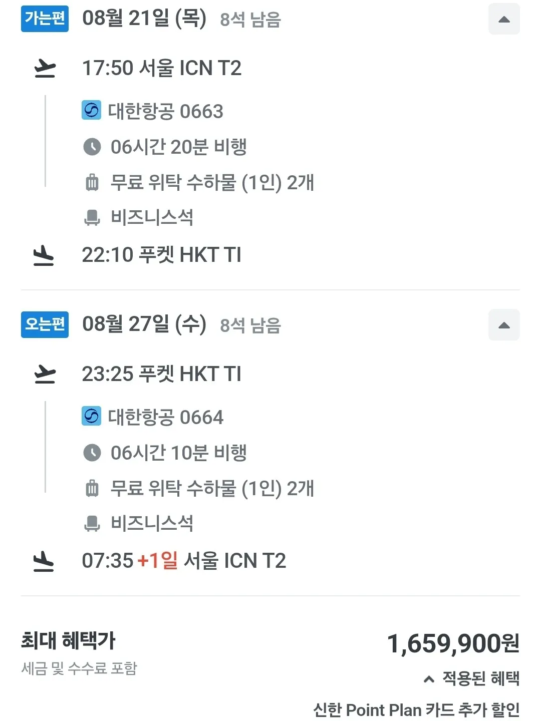 아시아나 항공 푸켓 비즈니스 왕복 티켓이 단돈 831,300원이라고 해요.