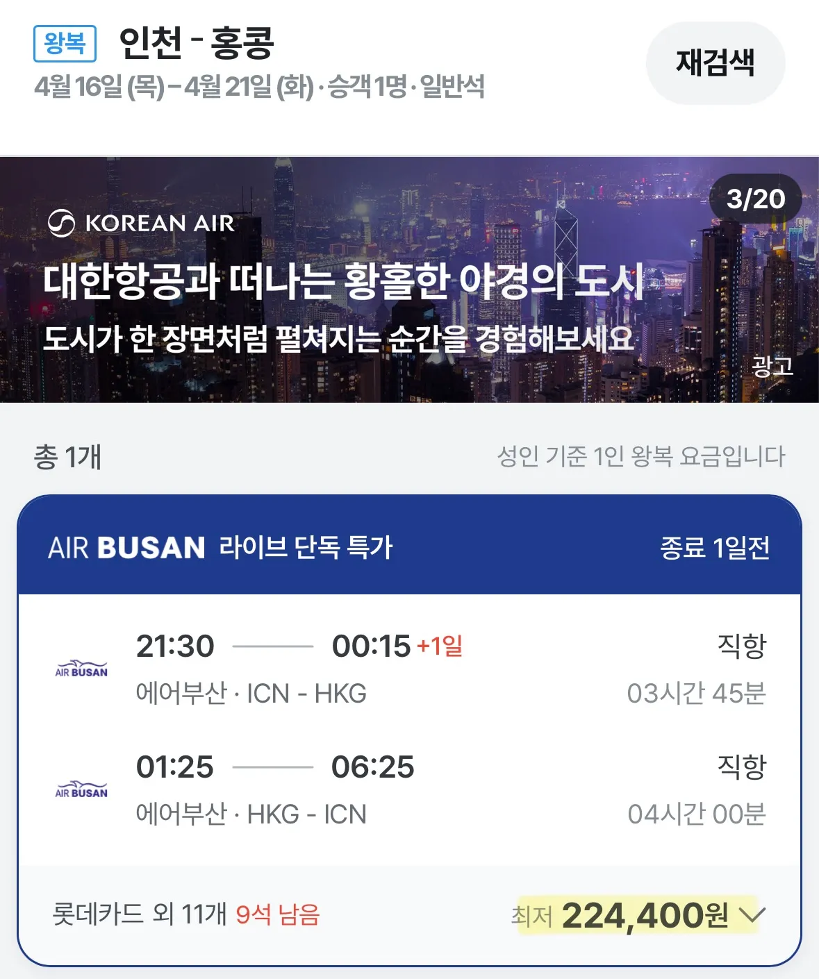목요일 퇴근 후 바로 홍콩으로 떠나보세요! 항공권은 위탁수하물을 포함해 단돈 21.5만 원이에요.