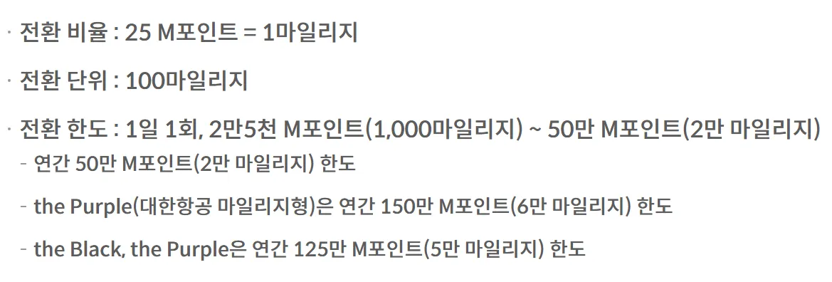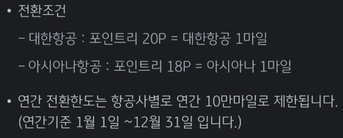 - 연간 한도 최대 250만 포인트(10만 마일), 한도는 보유 카드에 따라 다름
