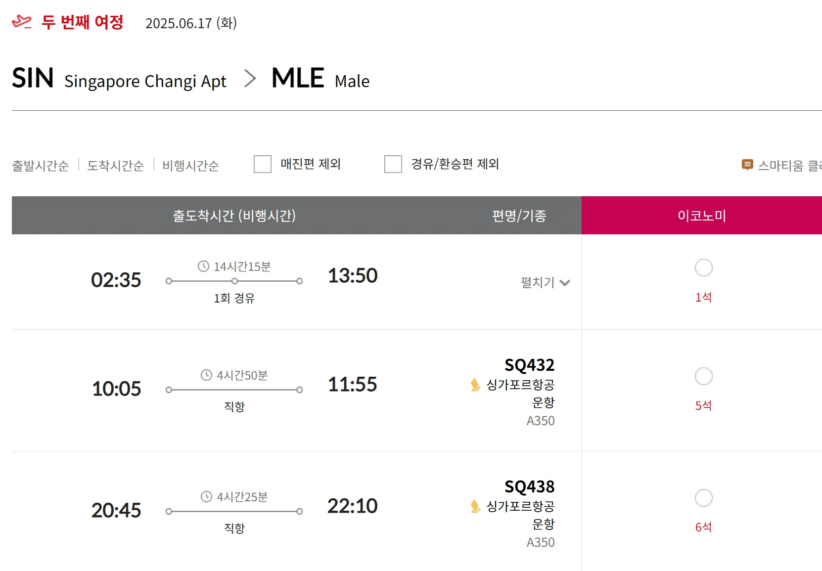 3. (편도/스얼) 한국 → 동남아/서남아(몰디브) : 한국 → 방콕(레이오버)  → 싱가포르, 한국 → 싱가포르(레이오버)  → 몰디브 등 가능