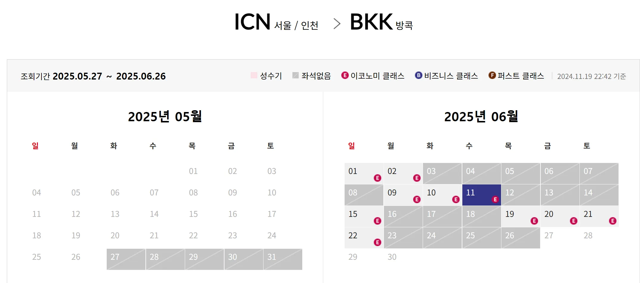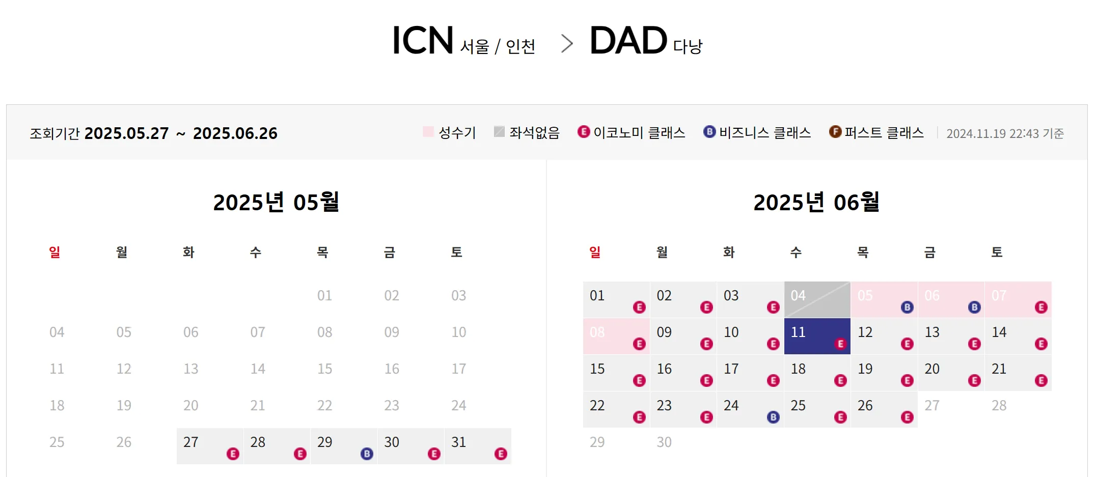 ▼ 인천 출발 방콕/다낭 보너스 좌석 현황(2025년 5월~6월)
