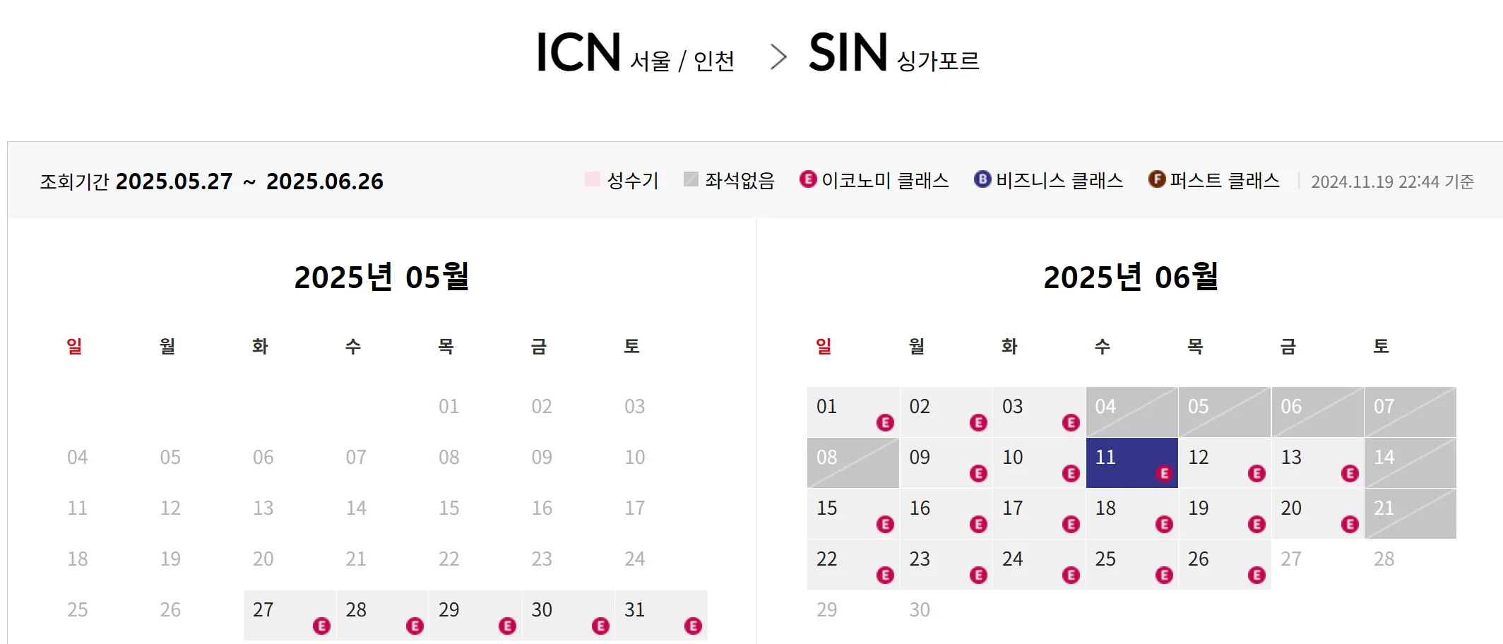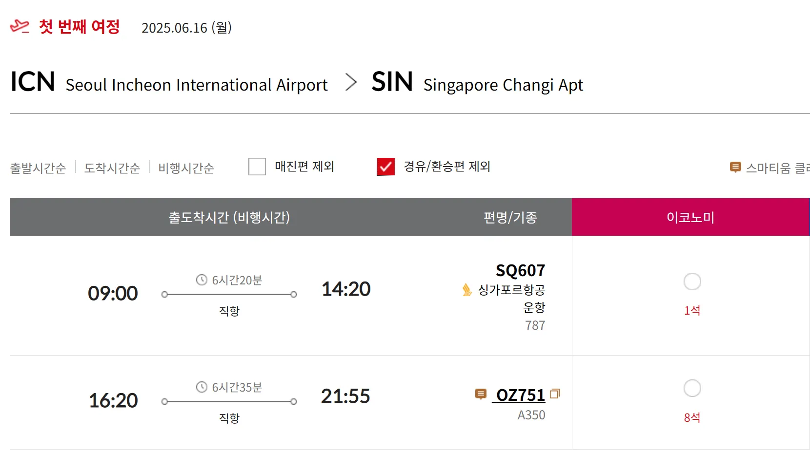 ▼ 인천 출발 싱가포르 보너스 좌석 현황(8석 발권 가능) - 6/16일 21:55 SIN 도착, 6/17일 20:45 SIN 출발(레이오버) · 25,000마일 공제