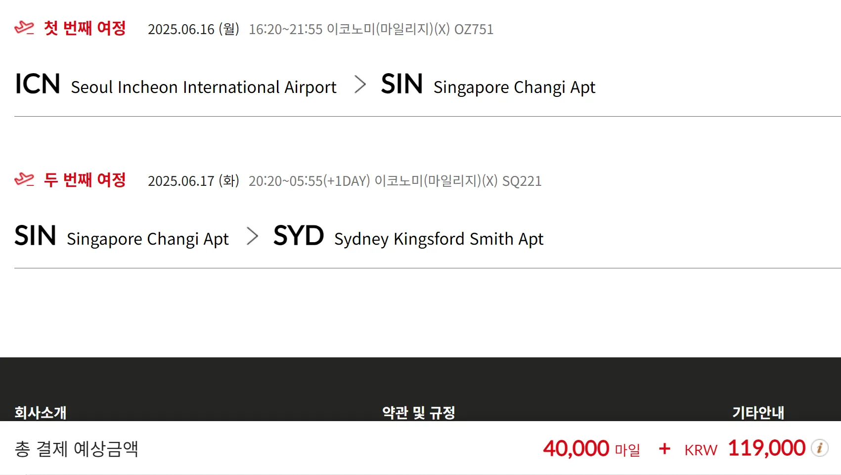 ▼ 인천 출발 시드니 노선(싱가포르 레이오버 포함) · 40,000마일 공제