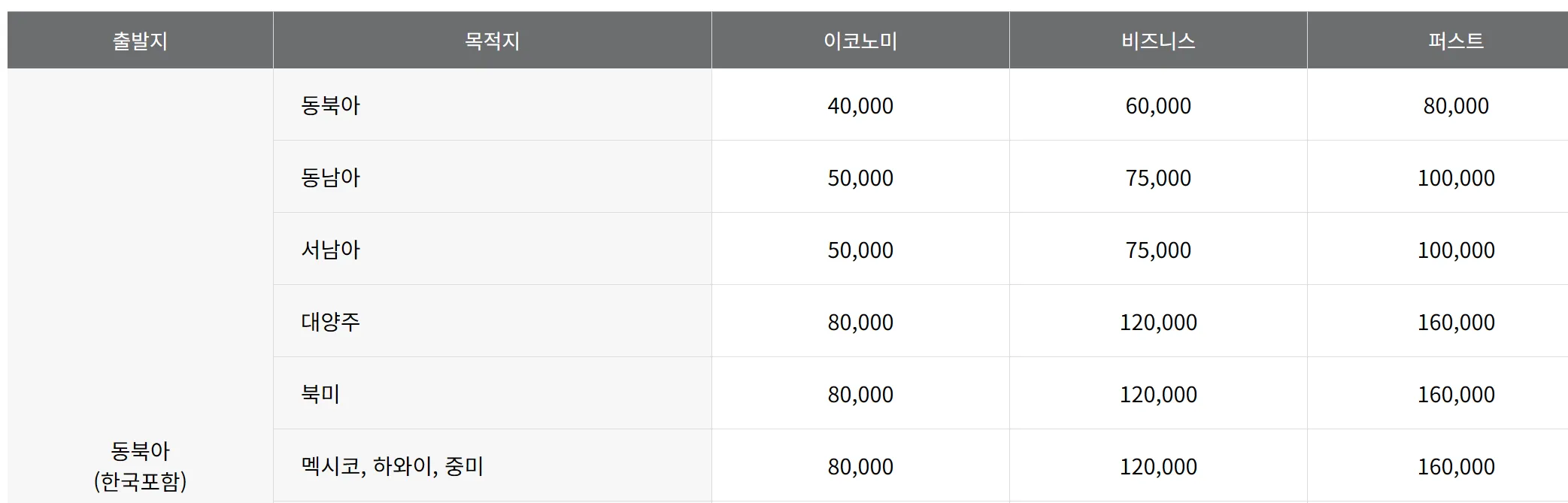 4만 마일 이상이면 왕복 티켓도 구매할 수 있고, 잘 찾으면 비즈니스 티켓 노선도 구매 가능합니다.