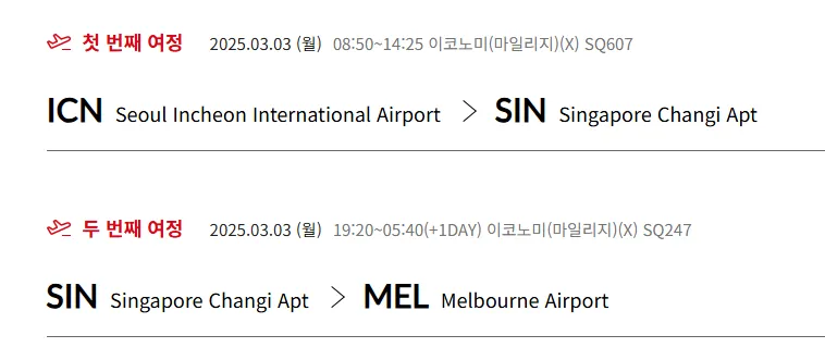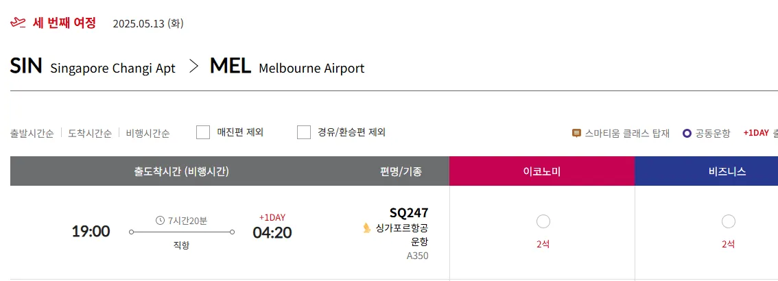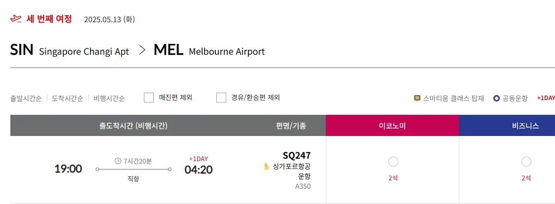 ③ (싱가포르 항공) 싱가포르(SIN) ↔ 멜버린: 인천 ↔ 싱가포르 구간의 비즈 좌석을 공유 안해줌