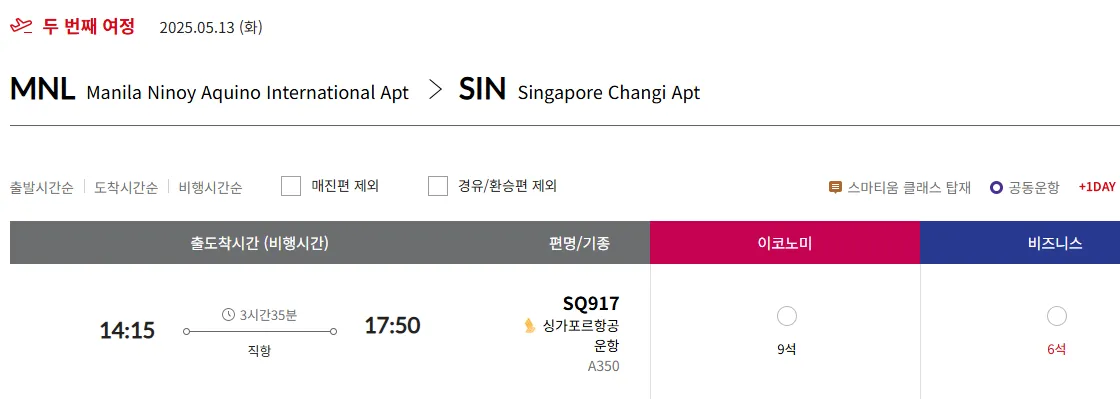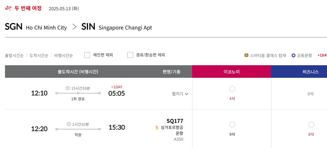 싱가포르 여형을 원하시거나 최소 환승을 원하는 경우 마일리지로 이코노미 좌석 발권도 가능합니다.