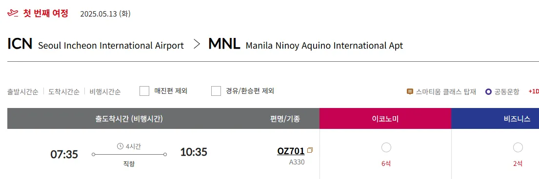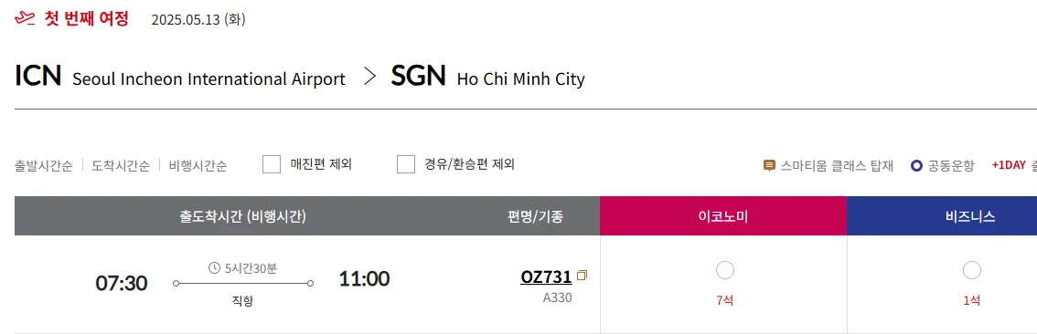 - 중간에 1시간 10분 환승 시간이 있지만, 전 구간 비즈니스 좌석 가능합니다.