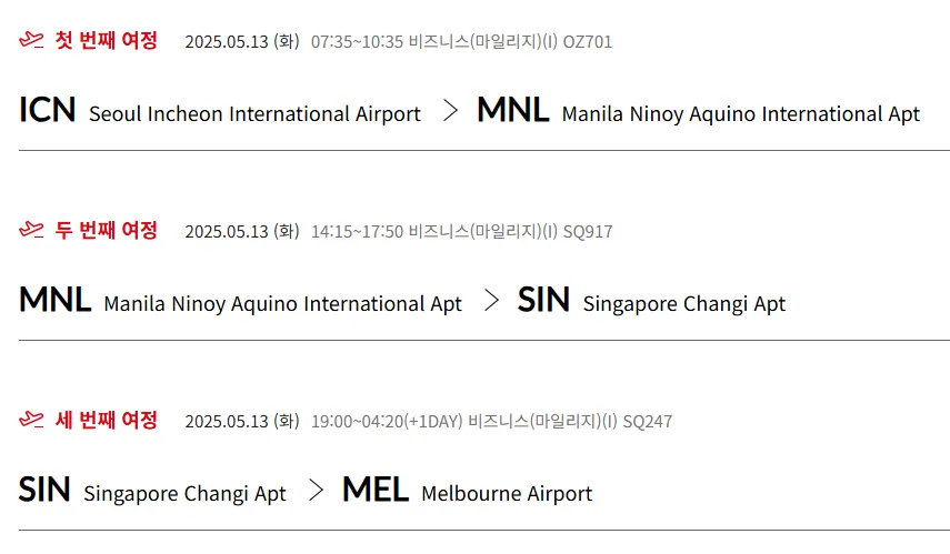 - 아시아나 항공 ‘인천 → 싱가포르’ 구간 비즈 좌석이 있는 날짜에, 싱가포르 항공 ‘싱가포르 → 멜버린’ 구간 비즈 좌석을 구간별로 조회해 예약합니다.