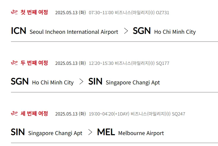 ▶ (아시아나/싱가포르) 인천 ↔ 호치민 ↔ 싱가포르 ↔ 멜버린(총 21시간)