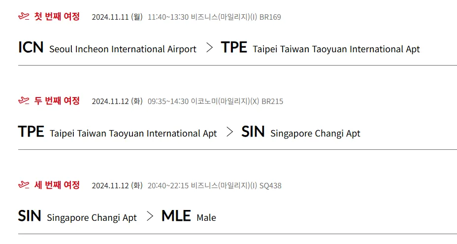 ✅ 몰디브 도착 비즈니스 좌석 노선(2회)