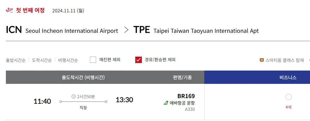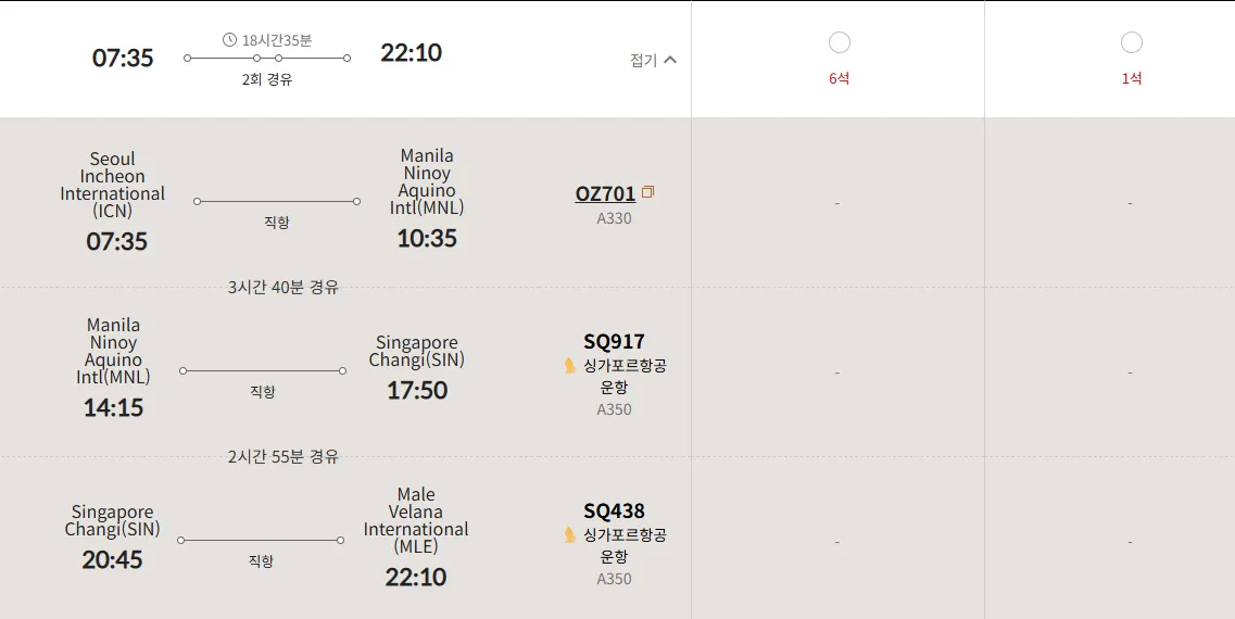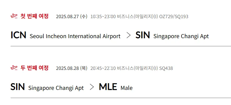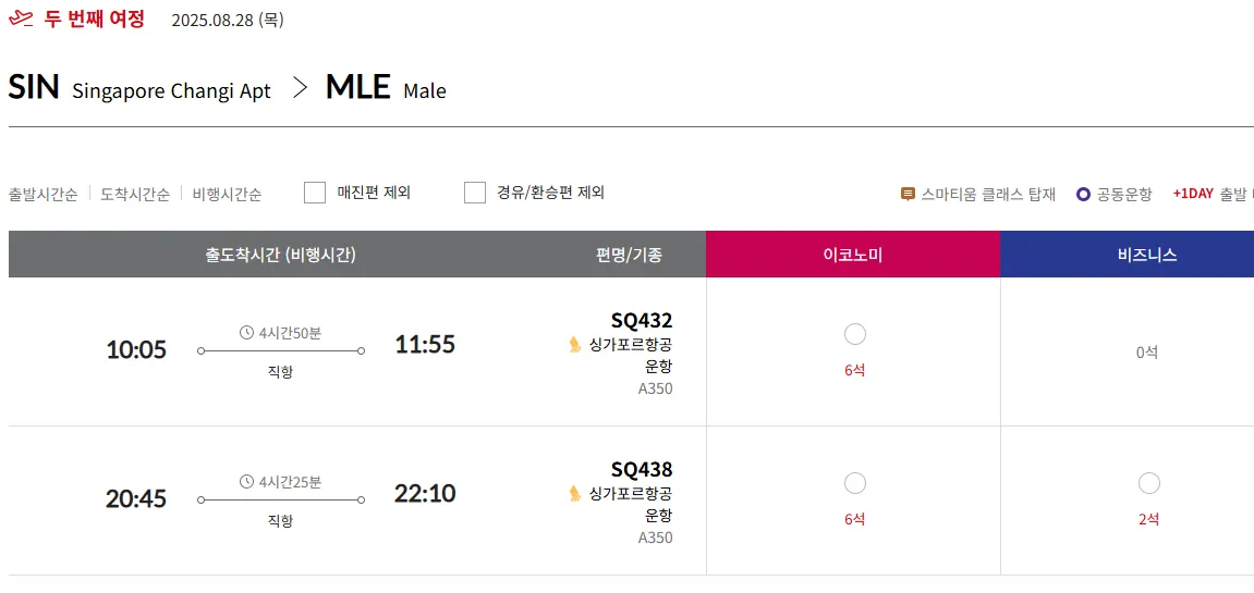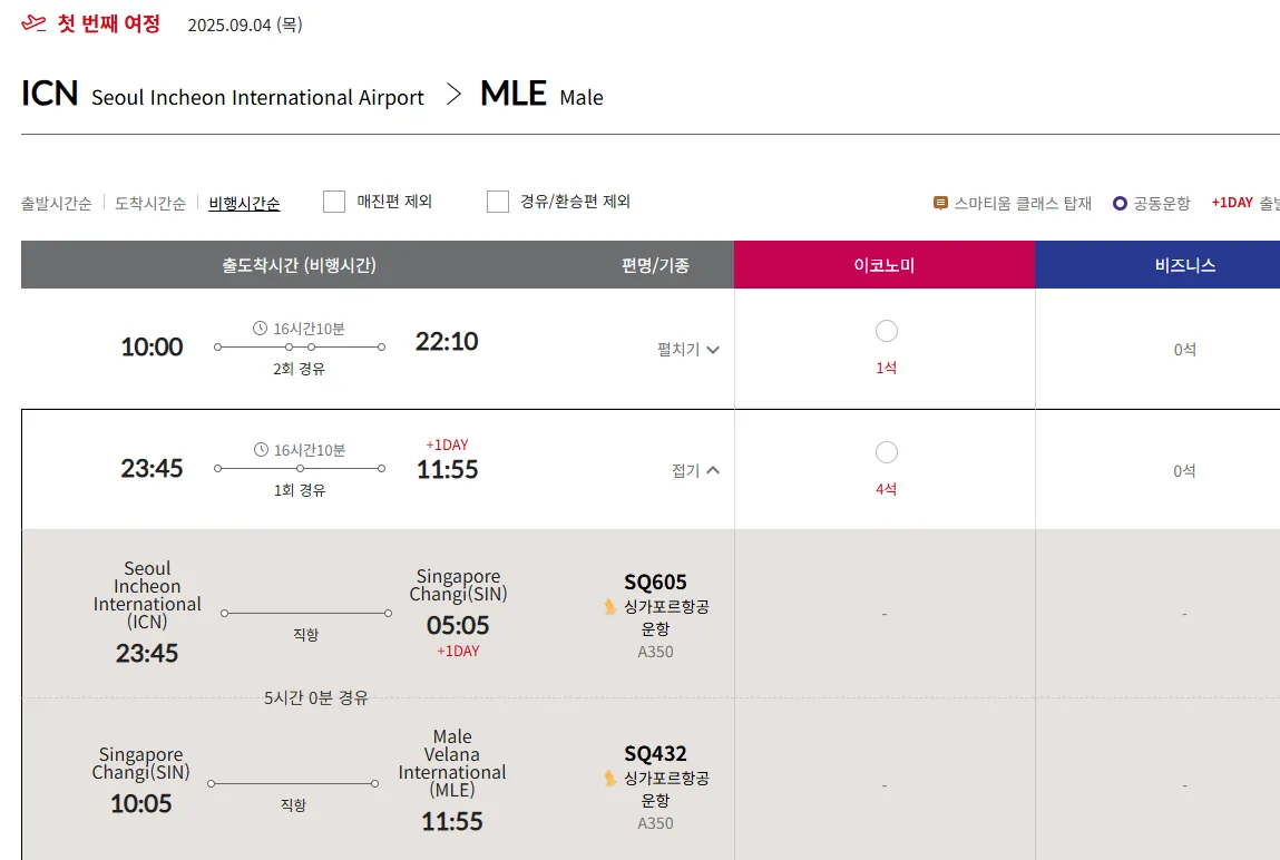 “ICN → SIN  → MLE” 구간을 비즈 좌석으로 예약하기 쉽지 않습니다.