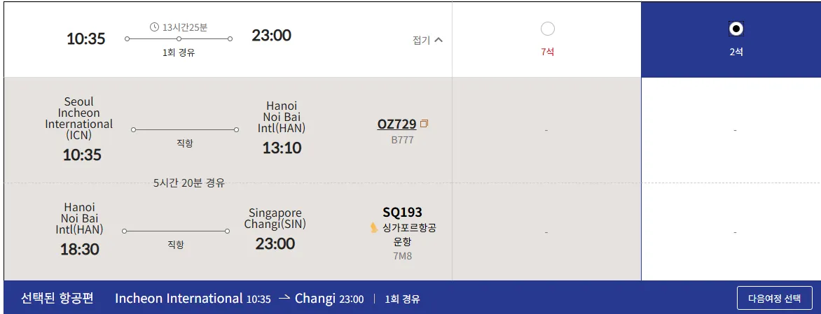 아쉽게도 “ICN → SIN” 노선의 비즈니스 좌석 예약이 쉽지 않기 때문에,