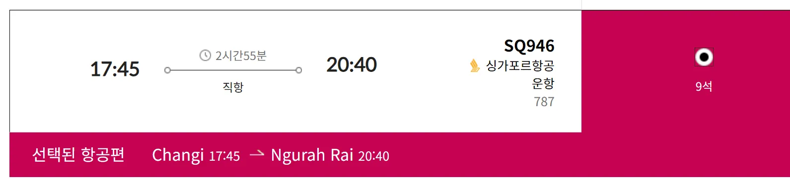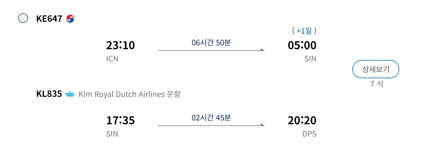 최고의 방법은 ‘인천 ↔ 싱가포르 ↔ 발리’ 노선인데, '싱가포르 ↔ 발리' 은 2시간 정도 소요됩니다.
